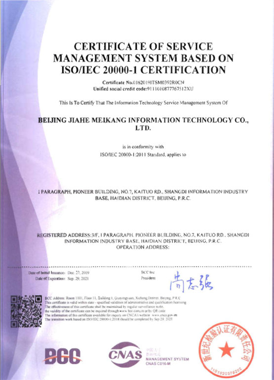12月,嘉和美康順利通過國家權威機構(gòu)ISO20000:2011管理體系測評,榮獲ISO20000信息技術服務管理認證。