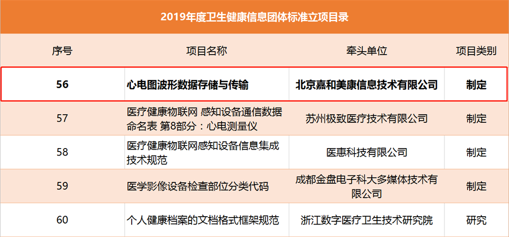 12月,2019年度衛(wèi)生健康信息團體標準立項項目發(fā)布。其中,由嘉和美康申報的《心電圖波形數(shù)據(jù)存儲與傳輸標準》獲批立項。該項目的獲批,全面體現(xiàn)了嘉和美康創(chuàng)新意識、技術研發(fā)能力在行業(yè)中的引領作用。