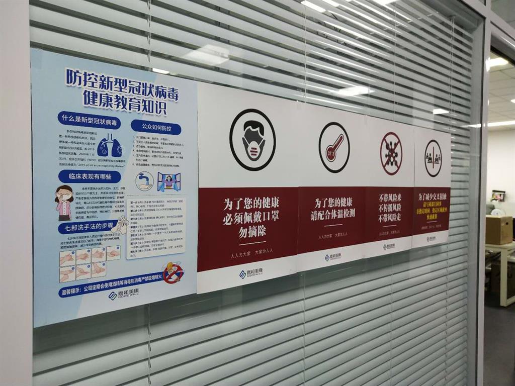 根據(jù)各地防疫要求,設(shè)計安全復(fù)工方案,獲得批準(zhǔn)后,嘉和美康所有辦公場均根據(jù)方案執(zhí)行。保潔人員提前對公司地面、樓道等進(jìn)行無死角的消殺保潔工作;采購足量的口罩、護(hù)目鏡、一次性手套、酒精、消毒液、洗手液等衛(wèi)生防護(hù)物資,全力保障員工安全。