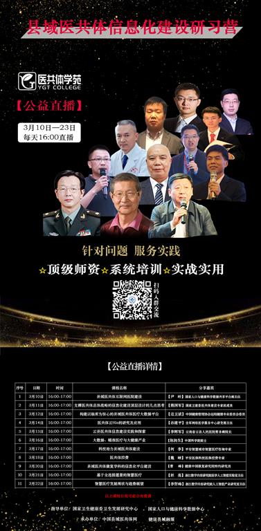 1月10日—23日,在國家衛(wèi)健委衛(wèi)生經(jīng)濟發(fā)展研究中心和國家人口健康科學數(shù)據(jù)中心的指導下,由中國醫(yī)院協(xié)會醫(yī)共體分會(籌)主辦,中國縣域醫(yī)共體網(wǎng)和健康縣域融媒承辦,策劃和組織線上“醫(yī)共體信息化建設(shè)研習營”。屆時,專家學者將圍繞縣域醫(yī)共體信息化建設(shè)的頂層規(guī)劃、業(yè)務架構(gòu)、技術(shù)架構(gòu)、系統(tǒng)功能等方面進行全面講解。