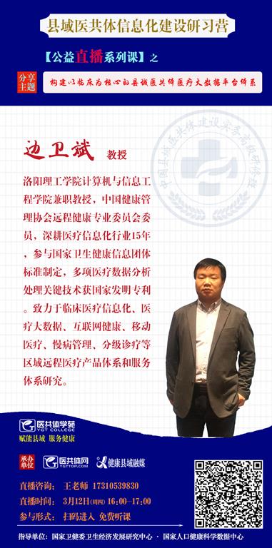3月12日(周四)16:00—17:00,北京嘉和美康心臟事業(yè)部總經(jīng)理、中國健康管理協(xié)會遠程健健康專業(yè)委員會委員邊衛(wèi)斌將以“構(gòu)建以臨床為核心的縣域醫(yī)共體醫(yī)療大數(shù)據(jù)平臺體系”為主題進行直播分享,為大家全面講解在5G時間技術(shù)革新浪潮下,嘉和美康如何利用互聯(lián)網(wǎng)、大數(shù)據(jù)、人工智能構(gòu)建“一中心四平臺”的縣域醫(yī)共體健康云平臺。