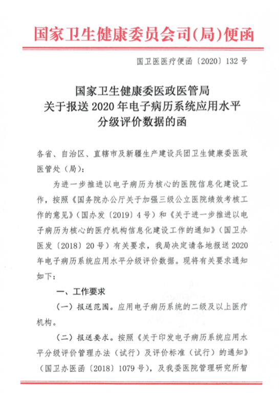為進(jìn)一步推進(jìn)以電子病歷為核心的醫(yī)院信息化建設(shè),按照《國(guó)務(wù)院辦公廳關(guān)于加強(qiáng)三級(jí)公立醫(yī)院績(jī)效考核工作的意見》和《關(guān)于進(jìn)一步推進(jìn)以電子病歷為核心的醫(yī)療機(jī)構(gòu)信息化建設(shè)工作的通知》,國(guó)家衛(wèi)生健康委醫(yī)政醫(yī)管局發(fā)布《關(guān)于報(bào)送2020年電子病歷系統(tǒng)應(yīng)用水平分級(jí)評(píng)價(jià)數(shù)據(jù)的函》,請(qǐng)各地報(bào)送2020年電子病歷系統(tǒng)應(yīng)用水平分級(jí)評(píng)價(jià)數(shù)據(jù)。