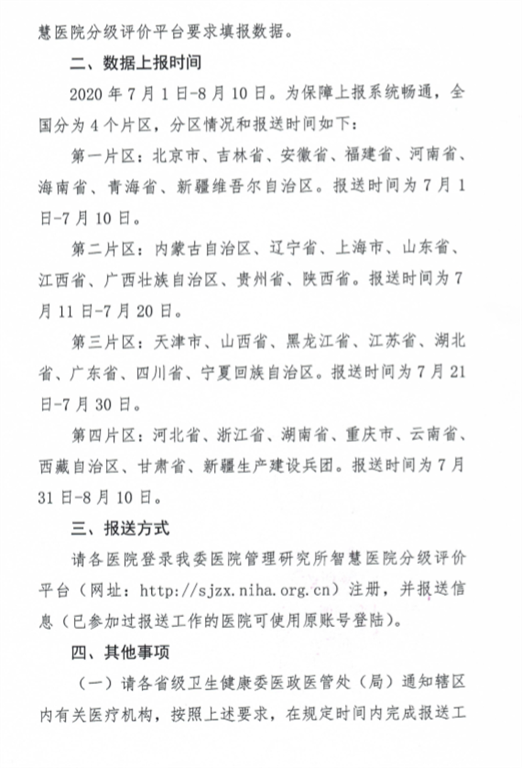 數(shù)據(jù)上報(bào)時(shí)間為2020年7月1日-8月10日。登錄醫(yī)院管理研究所智慧醫(yī)院分級(jí)評(píng)價(jià)平臺(tái)(http://sjzx.niha.org.cn)注冊(cè)報(bào)送,為保障上報(bào)系統(tǒng)暢通,全國(guó)分為4個(gè)片區(qū),根據(jù)不同時(shí)間段報(bào)送。