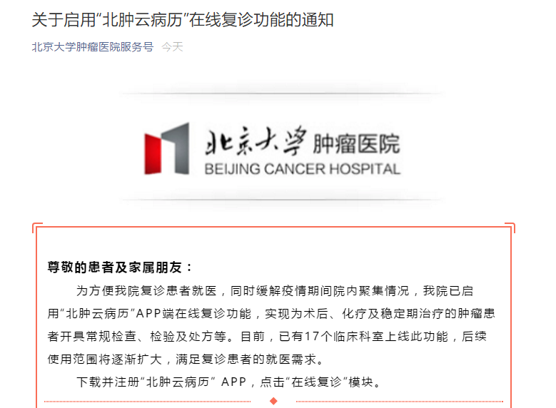 近期,由嘉和美康提供技術(shù)支持的北京大學(xué)腫瘤醫(yī)院“北腫云病歷”APP端在線復(fù)診功能正式開通。