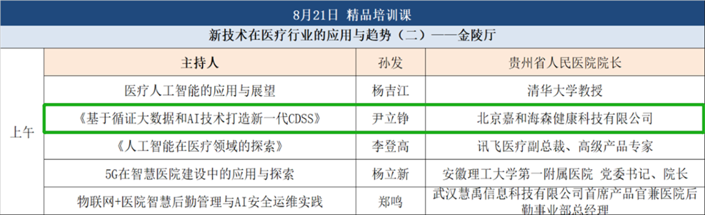 會(huì)議期間,嘉和海森健康大數(shù)據(jù)事業(yè)部醫(yī)療AI高級(jí)專家尹立錚將于8月21日“新技術(shù)在醫(yī)療行業(yè)的應(yīng)用與趨勢”精品培訓(xùn)課中以《基于循證大數(shù)據(jù)和AI技術(shù)打造新一代CDSS》為題,詳細(xì)闡述嘉和美康基于歷史病歷學(xué)習(xí)與循證醫(yī)學(xué)知識(shí)庫“雙引擎”的新一代CDSS技術(shù)與應(yīng)用。