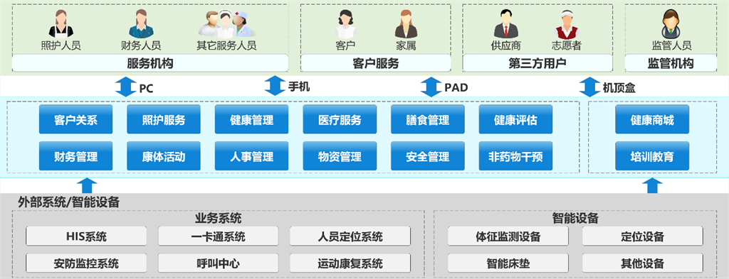 嘉和健康養(yǎng)老管理信息系統(tǒng)以客戶一體化養(yǎng)老需求為出發(fā)點,從入出轉等業(yè)務辦理到養(yǎng)護文娛等日常養(yǎng)老生活,很好的支撐了養(yǎng)老運營的標準化、精細化、智能化管理需求。系統(tǒng)結合各類智能終端,通過與相關外部系統(tǒng)及智能設備的對接,形成一體化醫(yī)養(yǎng)結合養(yǎng)老解決方案。
