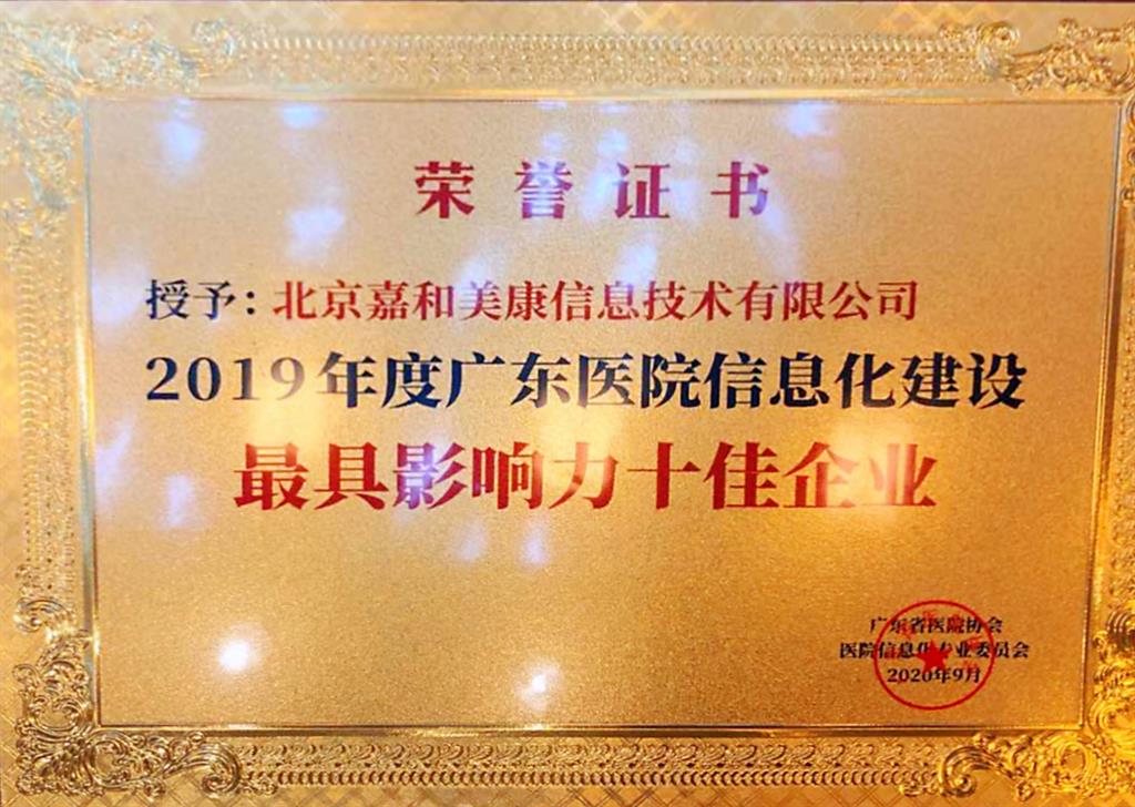 嘉和美康獲得“2019年度廣東醫(yī)院信息化建設(shè)最具影響力十佳企業(yè)”榮譽稱號