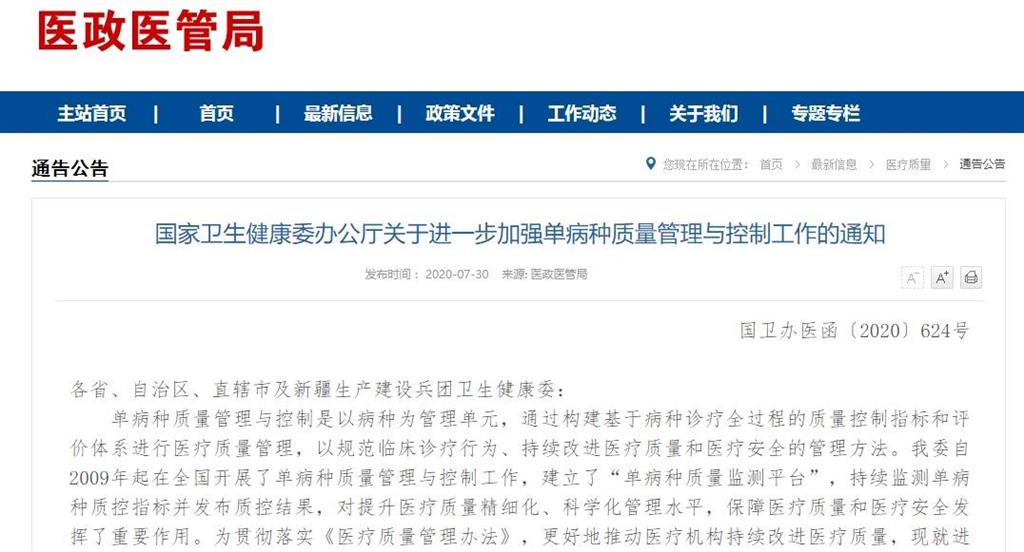 醫(yī)政醫(yī)管局發(fā)布《國(guó)家衛(wèi)生健康委辦公廳關(guān)于進(jìn)一步加強(qiáng)單病種質(zhì)量管理與控制工作的通知》公告