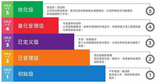 CMMI是一套融合多學(xué)科、多領(lǐng)域、可擴(kuò)充的過(guò)程能力成熟度集成模型,代表著國(guó)際上最先進(jìn)的軟件工程管理方法,是國(guó)際公認(rèn)的衡量軟件企業(yè)業(yè)務(wù)能力成熟度和項(xiàng)目管理水平的權(quán)威標(biāo)準(zhǔn)。CMMI成熟度水平分為5個(gè)等級(jí),其中,CMMI5為該體系最高等級(jí)認(rèn)證,也是目前國(guó)際上軟件能力成熟度難度最大、級(jí)別最高的認(rèn)證,是企業(yè)軟件研發(fā)標(biāo)準(zhǔn)化、規(guī)范化、成熟度等方面優(yōu)異表現(xiàn)的最高認(rèn)證。