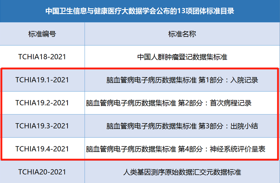 中國(guó)衛(wèi)生信息與健康醫(yī)療大數(shù)據(jù)學(xué)會(huì)公布的13項(xiàng)團(tuán)體標(biāo)準(zhǔn)目錄局部