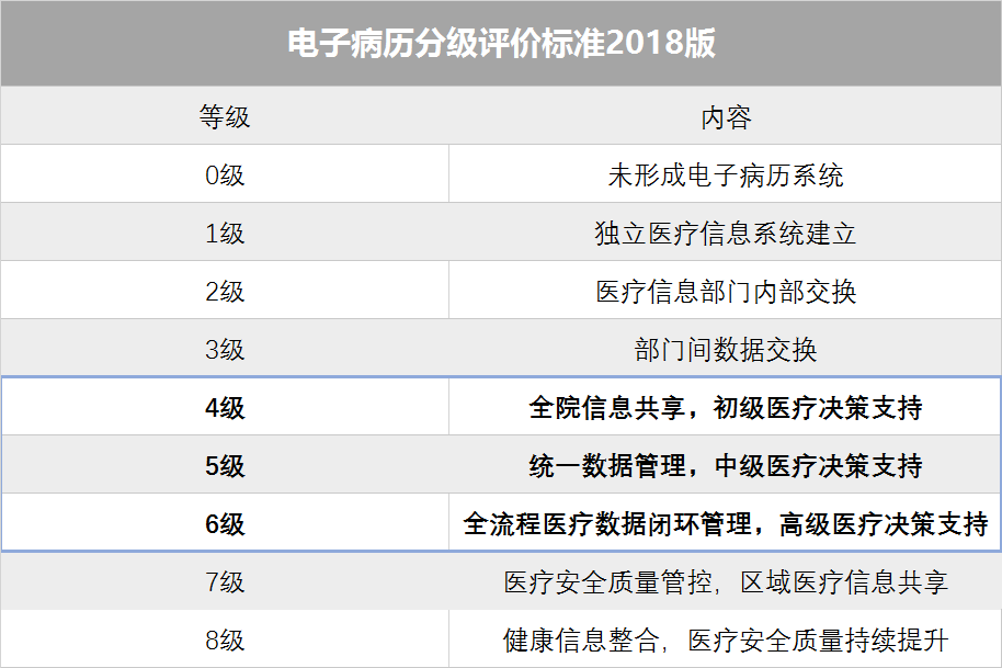 在國(guó)家衛(wèi)生健康委員會(huì)印發(fā)的《關(guān)于進(jìn)一步推進(jìn)以電子病歷為核心的醫(yī)療機(jī)構(gòu)信息化建設(shè)工作的通知》中要求:到2020年,轄區(qū)內(nèi)所有三級(jí)醫(yī)院要達(dá)到電子病歷應(yīng)用水平分級(jí)評(píng)價(jià)4級(jí)以上。即醫(yī)院內(nèi)實(shí)現(xiàn)全院信息共享,并具備醫(yī)療決策支持功能。