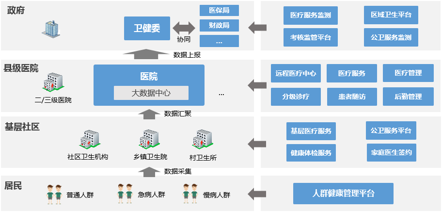 嘉和縣域醫(yī)共體解決方案以縣級醫(yī)院為主體,整合縣鄉(xiāng)各醫(yī)療衛(wèi)生資源,對共同體內(nèi)醫(yī)療機(jī)構(gòu)集團(tuán)化運(yùn)營管理。對縣級醫(yī)院、鄉(xiāng)鎮(zhèn)衛(wèi)生院、社區(qū)衛(wèi)生服務(wù)中心的管理體制和運(yùn)行機(jī)制的完善實(shí)現(xiàn)信息支撐,形成服務(wù)共同體、責(zé)任共同體、利益共同體、管理共同體進(jìn)行決策支持,實(shí)現(xiàn)人財(cái)物統(tǒng)合管理。