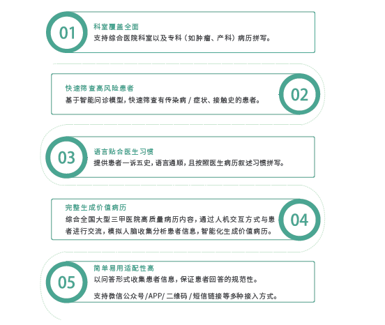該系統(tǒng)支持綜合醫(yī)院、專(zhuān)科醫(yī)院等多類(lèi)型醫(yī)療機(jī)構(gòu)使用場(chǎng)景,支持結(jié)構(gòu)化數(shù)據(jù)輸出和科研隨訪數(shù)據(jù)采集,具有覆蓋科室全面、語(yǔ)言貼合醫(yī)生習(xí)慣、完整生成價(jià)值病歷和快速篩查高風(fēng)險(xiǎn)患者等優(yōu)勢(shì)。