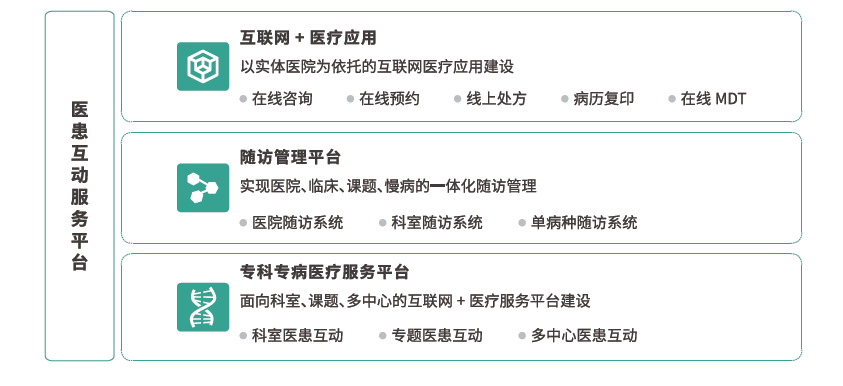 基于對互聯(lián)網(wǎng)+ 醫(yī)療服務(wù)模式的長期探索和理解,以”醫(yī)患互動”產(chǎn)品理念為核心,創(chuàng)新和技術(shù)為驅(qū)動,建立醫(yī)患互聯(lián)互動通道,為醫(yī)院與患者提供專業(yè)、高效的智能化醫(yī)療服務(wù)。平臺結(jié)合互聯(lián)網(wǎng)技術(shù)、AI 智能技術(shù)與大數(shù)據(jù)技術(shù),為醫(yī)院提供互聯(lián)網(wǎng)醫(yī)院解決方案、隨訪管理解決方案和互聯(lián)網(wǎng)+ 專科專病醫(yī)療服務(wù)平臺解決方案,助推醫(yī)院智慧化建設(shè)。